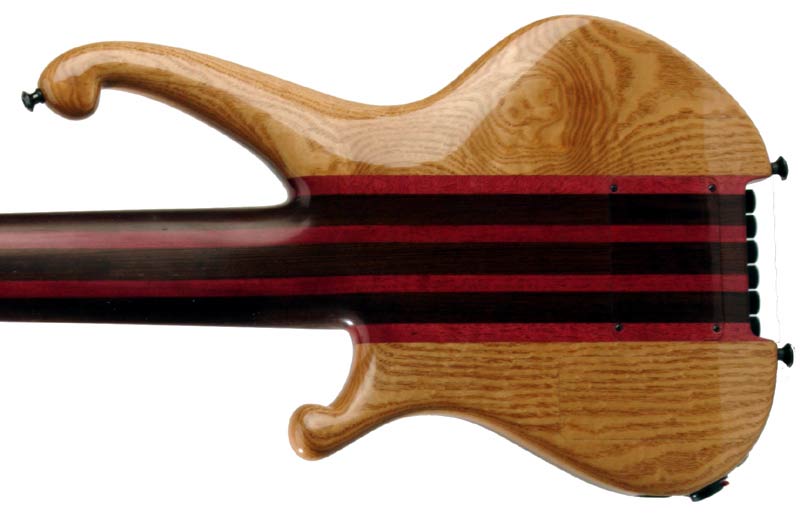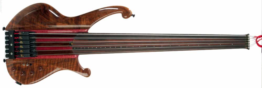 Model: 6 string fretless D bass Body woods: Claro walnut top, sassafras back and purpleheart rails Neckwoods: Wenge and purpleheart neck with macassar ebony fingerboard Finish: Dupont Chromaclear Pickups and electronics: Lightwave with Icetone piezo bridges, 3 band eq with sweepable mids, magnetic emulation and 1 hour charging circuit. 13 pin MIDI output with separate volume and controler switch. Wittman electronic tuner. Location: Santa Monica Year: 2003 Special features: The MIDI output from the Lightwave system was quite complicated and I couldn't have done it without the hand holding and technical expertise of Lightwave's engineer, Keith Frezon. This bass had 3 stacked pots to accommodate all the controls. Owner comments: Paul