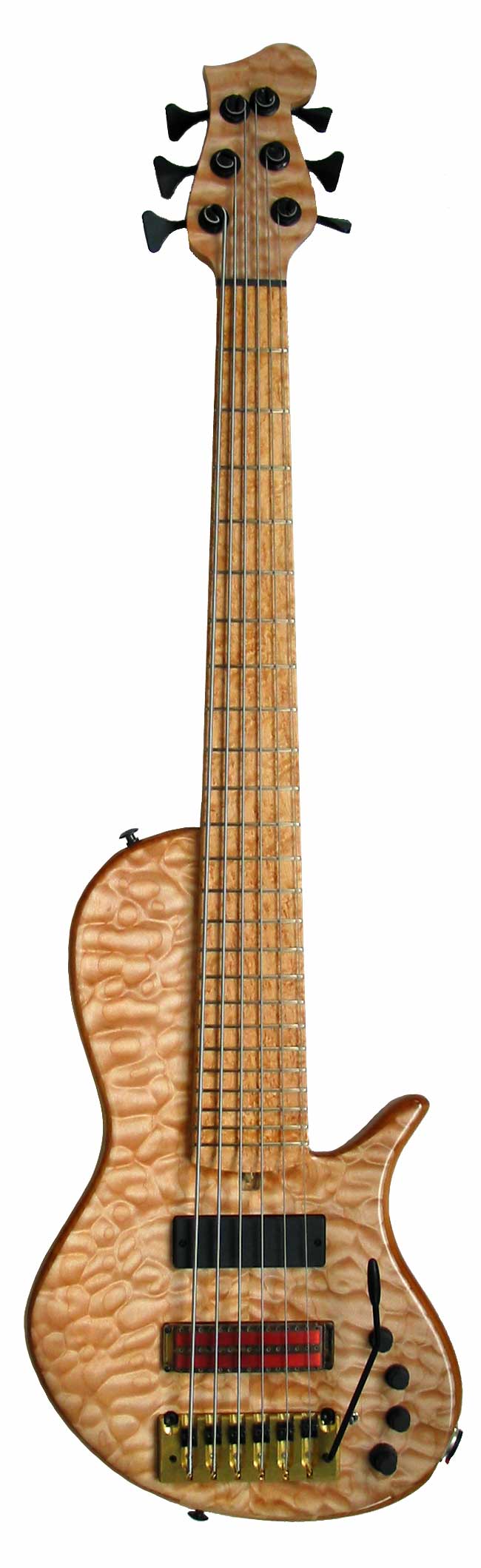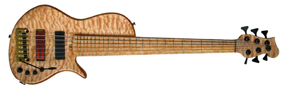 Model: Dave Captein signature bass Body woods: Quilted maple top, african mahogany back . Neckwoods: Tapered rock maple neck with birdseye maple fingerboard Hardware: Custom solid brass tremolo bridge with tusq saddles. Scale length: 34", long scale Weight: 9 lb Finish: PPG DCU-2002 Pickups and electronics: Q-Tuner BXXL soapbar -bridge, Bartolini P46-CX dual coil soapbar -neck. Bartolini 3 band eq with switchabable mid frequency. Active/passive push pull volume pot. Location: Portland, OR Year: 2004 Special features: This bass is a prototype of a new mid-priced model inspired by local jazz bassist, David Captein. The body has flat front and back and the top is a thin veneer as opposed to a thick piece of lumber. The neck is a 3 piece rock maple with tapered laminates. Fingerboard is a 34" scale length, birdseye maple with 24 medium frets and black dot side markers. Body core is Alder with figured walnut, bookmatched walnut veneer on the back. The tuners are Hipshot Ultralights and the bridge is a custom 6 string trem patterned on the Hipshot design. String spacing is 18.5 mm at the bridge and 9 mm at the nut. The bridge pickup is a custom Q-Tuner high impedance BXXL. Neck pickup is a Bartolini CX. Active electronics are a 3 band NTMB-918 with passive bypass. Owner comments: **** 1.23.2006 |
