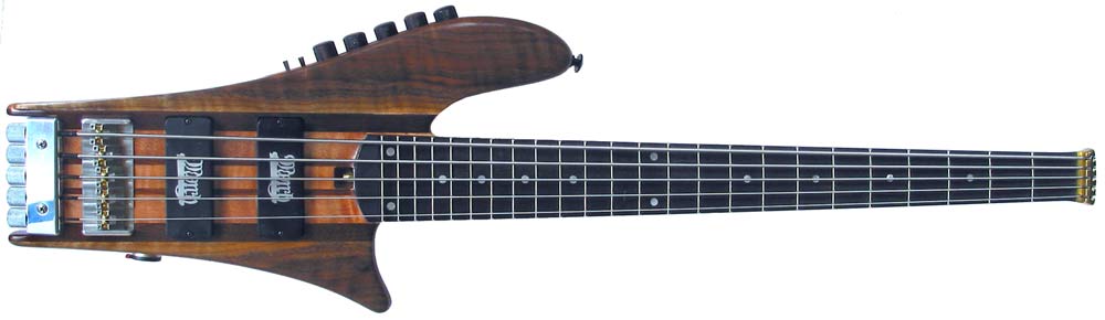 Model: 5 string A bass Body woods: Claro walnut top, narra back, peruvian walnut rails. Neckwoods: Maple and pao-ferro neck with ebony fingerboard Hardware: 6061-T6 alloy, RMC saddles. Finish: Tru-oil over blond shellac, stain over center stripes Pickups and electronics: M¿rch dual coil ceramic and steel pickups, RMC Bass Excellence piezo saddles. 18v Aguilar OBP1 -2 band eq, RMC µDiff piezo preamp with piezo / mag blend, coil tap -series, parallel, single coil switches for both pickups, active / passive switch. Wittman tuner Location: Essex, VT Year: 2005 Special features: post eq volume, active eq / piezo blend Owner comments: "I'll try to let you know about playing the bass. Ok, here goes. 1. The other night I sat in with the Duo I've been touring a bit with. Set 1, I played a couple songs. It was interesting. I noticed practicing back stage that it's hard to play while sitting because of the short distances above and below the bridge area. Those songs in set one were good; I brought a bass amp to avoid the moniter situation. I was pretty far from the amp. The middle strings were very punchy - like a hump around D and E on the A string that was boomy. When I had a breakdown it was beautifully aggresive, like a sound that only people like Les Claypool can get, and he plugs a signal into a guitar amp with distortion all the time, in addition to the bass amp. But in the middle of a normal jam it got a little lost. Like there's low and high but not enough mid or something. 2. Then I played some songs in the second set. That was the best yet. I stood in front of the amp that time. They also cranked it in the house, and Grippo was playing saxaphone too. Standing by the amp, all the strings and notes were consistent. It was so weird because I had feelings that I hadn't had before in that way with any bassÊ - like total consistent punchiness with every note and a nice growly edge due to some compression in the bass or amp, and also the amp's built in compressor made it pump. It was sort of a dream come true. Punchy sound with a nice mix of growl and clarity that I've always wanted and never had. Like my "voice" could sing in a way it can't on the modulus. But I say "sort of" because the things that I do like about the Modulus weren't there, as one would expect - like EMG clarity in the low strings and low notes, and a midrange cutting that doesn't let up in any kind of jam. [by the way, when I went on for the second set I accidentally had it set passive, and that was sounding really good - a lot better than the first set. but then when I switched the active switch on it still sounded great. also by the way, against my guesses: I prefered the sound WITH some piezo mixed in, not just the magnetics, which were too "dark" alone in that setting] I've been loving the tuner, with all this said, it sure is a cool bass. Thanks. Nice work - I do keep showing it off to friends and bass players..."