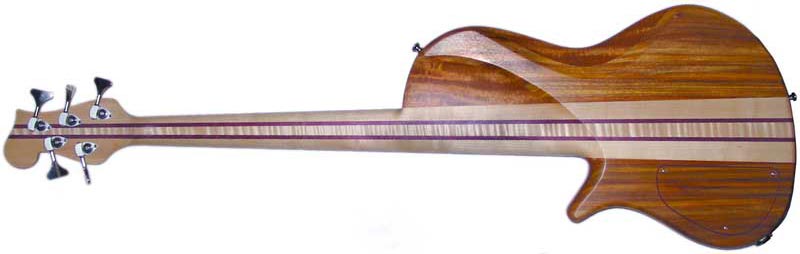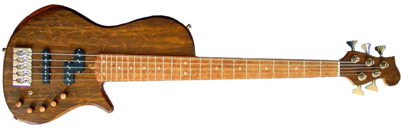 Model: Singlecut flat-top bass Body woods: imbuya top, African mahogany back and canarywood back. Neckwoods: rock maple and purpleheart neck with acrylicized birdseye maple fingerboard Hardware: Chrome plated Hipshot A style bridge and ultralight tuners. Scale length: 34" Weight: 8.4 lb Finish: Tru-Oil over shellac Pickups and electronics: Nordstrand P + J set. Audere Audio 3 band eq with switchabable mid frequency. Location: Portland, OR Year: July 2007 Special features: Guitar frets, tuned E-A-D-G-C Owner comments: 12.26.2010 |