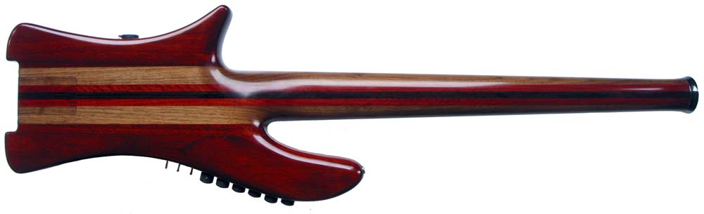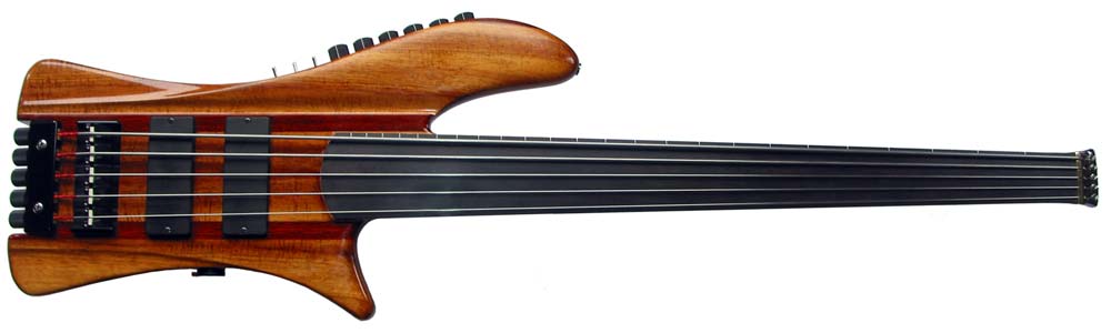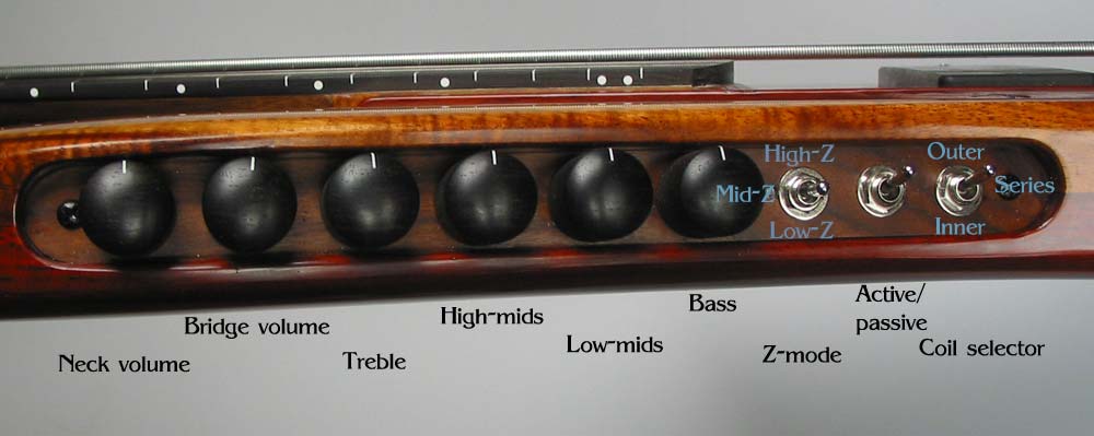 Model: B bass Body woods: Curly koa top, padauk back and rails. Neckwoods: walnut, bloodwood and wenge neck with African blackwood fingerboard Hardware: 6061-T6 alloy with black anodizing and tusq saddles. Scale length: 34" Weight: 8 lb, 4 oz Finish: West Systems finishing epoxy filler with Tru-oil. Pickups and electronics: King hybrid A2-A5, dual coil soapbar. Audere Audio 4 band eq with switchabable mid frequency. Z-mode switch, single/series/single coil switch for both pickups. Passive bypass. Controls: volume, volume, treble, high-mid, low-mid, bass.
