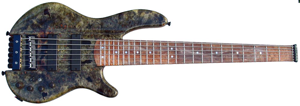 Model: Custom shape bass Body woods: Buckeye burl top, butternut back and wenge rails. Neckwoods: Walnut, wenge and chaktŽ-viga neck with acrylisized spalted maple burl fingerboard Hardware: 6061-T6 alloy with black anodizing and tusq saddles. Scale length: 34" Weight: 8.8 lb Finish: Dupont Chroma-Premier over epoxy filler Pickups and electronics: Bartolini split coil P-4 soapbars. Bartolini NTMB9-18 3 band eq with switchabable mid frequency and stacked bass/treble. Wittman onboard tuner. Location: Portland Year: 2007 Special features: Owner comments: 12.26.2010 |