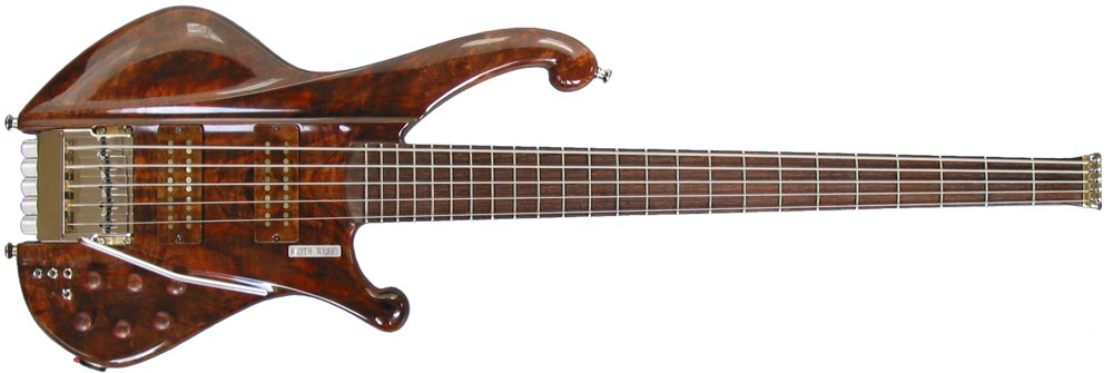 Model: D bass Body woods: Claro walnut top, Peruvian walnut back and purpleheart rails. Neckwoods: Wenge and purpleheart neck with acrylisized wenge fingerboard Hardware: 6061-T6 alloy with bright nickel plating and tusq saddles. Scale length: 34 Weight: 8.6 lb Finish: DuPont Chroma-Premier over epoxy filler Pickups and electronics: Nordstrand dual coil soapbars. Audere Audio 3 band eq with switchabable mid frequency, Z-mode. Graphtech Ghost piezo midi hexpander module with MIDI volume. Single/series/single coil switch for both pickups. Passive bypass for bridge pickup only. Wittman on-board tuner Location: Washington DC Year: 2007 Special features: Piezo saddle pickups, vibrato bridge, MIDI output, wood pickup covers, tuned E-A-D-G-C Owner comments: 12.26.2010 |